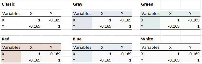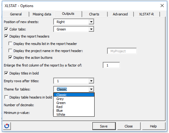 Go to the Outputs tab and click on the Theme for tables field. Select one of the proposed colors (see above) and then click on Save. Next time you run an XLSTAT analysis, all the outcome tables will be customized according to the theme you opted for.