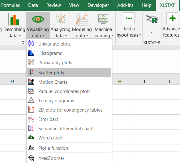 Seleccione el comando XLSTAT / Visualización de datos / Diagrama de dispersión (Scatter plots), o bien haga clic en el botón de la barra de herramientas Visualización de datos (ver más abajo).