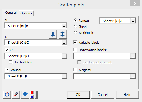 Tras hacer clic en el botón, aparece el cuadro de diálogo Diagrama de dispersión. En la pestaña General, seleccione los datos en la hoja de Excel de este modo: