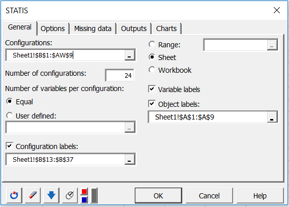 Select the data on the Excel sheet of the demo file that corresponds to the configurations (a configuration corresponds here to the set of coordinates given by a subject). Set the Number of configurations equal to 24 subjects.