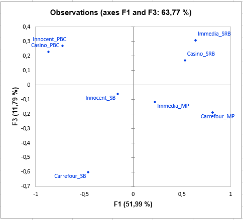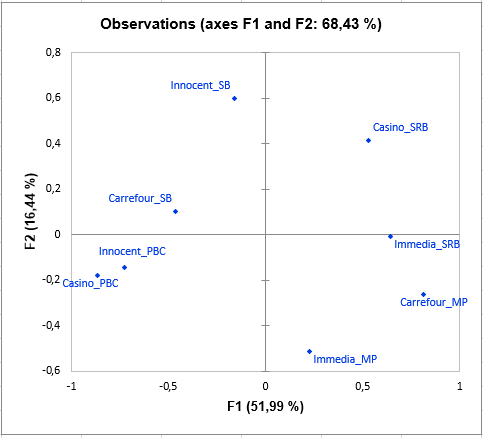 The following graph is the main objective of STATIS: to represent the observations on a 2-dimensional map, and thus to identify the proximities. For example, we see that "Casino_PBC" and "Innocent_PBC" smoothies are perceived as close, but they are very different from "Casino_SRB". On the third dimension, we can see that Carrefour_SB is totally opposed to "Casino_PBC", "Innocent_PBC", "Immedia_SRB" and "Casino_SRB".