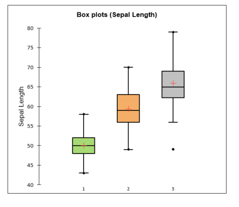Los datos corresponden a una muestra de 150 flores de iris en las que se han medido 4 variables. Las flores pertenecen a 3 especies diferentes. Fisher utilizó esta base de datos, que se ha hecho famosa, cuando desarrolló su teoría del análisis discriminante. En este ejemplo concreto, decidimos analizar la variable Longitud del sépalo de las flores para comprobar visualmente si hay diferencias entre las tres especies utilizando gráficos de caja (gráficos “box-and-whisker” o “box plots”).