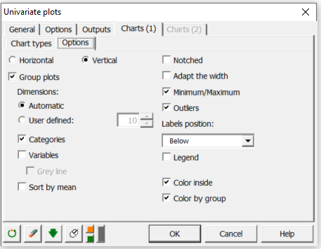 En la sub-pestaña Opciones, hemos elegido la opción Agrupar los gráficos, de forma que los gráficos de caja se muestren en el mismo gráfico, no de forma separada.