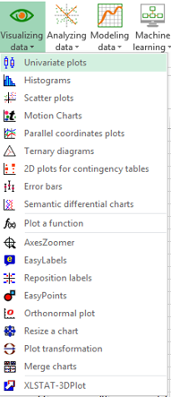 Tras abrir XLSTAT, seleccione el comando XLSTAT / Visualización de datos / Gráficos univaridaos, o bien haga clic en el botón Estadísticos descriptivos en la barra de herramientas Descripción de datos (ver más abajo).