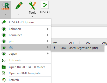 Type in the following code: <RScript replacebyvalue="true" > <ScriptLine replace="true" code="results=rfit(formula,data,symmetric,TAU)" /> <ScriptLine replace="true" code="results$CoefficientsDataFrame=as.data.frame(summary(results)$coefficients)" /> </RScript> There are two scriptlines. The first one calls the rfit R function. The formula object is automatically generated by XLSTAT thanks to the model data structure. With the replacebyvalue="true" method, all the elements included after are replaced by their values entered in the dialog box every time the dialog box will be executed. In the XML file, R results to show must be stored within a results object. This is why we created the results object in the first line and the CoefficientsDataFrame sub-object within the results object. Below is a typical R script generated with this code. This script is automatically generated in the XLSTAT-R working directory every time you execute the feature in XLSTAT. The script file is likely to be found here: %AppData%\ADDINSOFT\XLSTAT\XLSTAT-R\datastore\Rfitresults\rfit.script.R > list.of.packages <- c('Rfit')