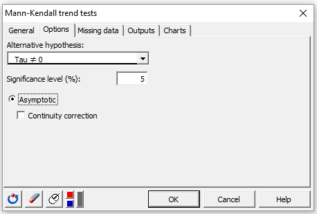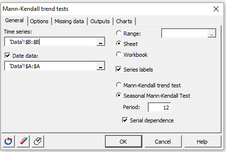 Se pueden aplicar dos pruebas: la prueba clásica de tendencia Mann-Kendall para comprobar si hay una tendencia en las series de tiempo; o la prueba estacional de Mann-Kendall, que tiene en cuenta la estacionalidad de la serie temporal (en este caso 12 meses).