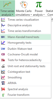 Una vez abierto XLSTAT, haga clic en el botón Análisis de series temporales, y seleccione Pruebas de tendencia de Mann-Kendall (véase siguiente captura de pantalla).
