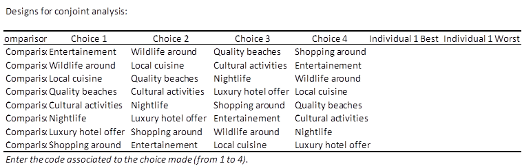 Como parte de este análisis, se ha preguntado a 5 personas acerca de sus preferencias en cuanto a destino turÃstico. Los resultados están disponibles en la hoja MaxDiff.