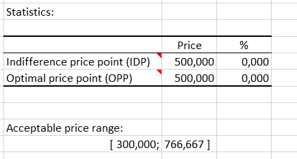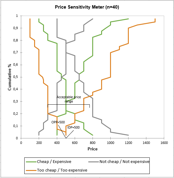 The example below corresponds to a survey on the price of the laptops of middle of the range. Although the number of data and the granularity of the prices is low, we use âPrice Sensitivity Meterâ of Van Westendorp to analyze what would be the acceptable price range for such a laptop and to determine for the interviewed population which would be the optimal price for an optimal number of sales or an optimal revenue.