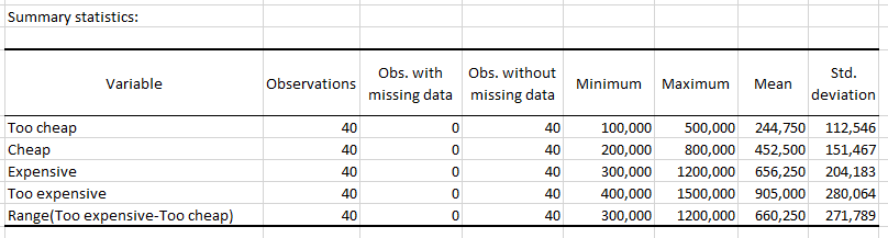 The descriptive statistics allow in particular to identify the values minimum and maximum. The amplitude is calculated on the too cheap price and the too expensive price. We note in particular that for at least a person, the gap is 1200 Euros what is rather important.