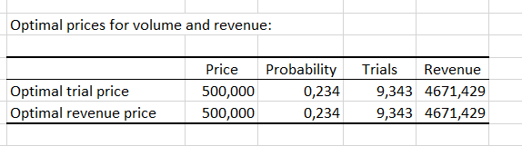The consideration of the intentions of purchase allows to define the price of the product by maximizing the chances that the impact is favorable on the volume or the revenue according to the chosen strategy. In the table above, we see that the price allowing to maximize both criteria is 500â¬.