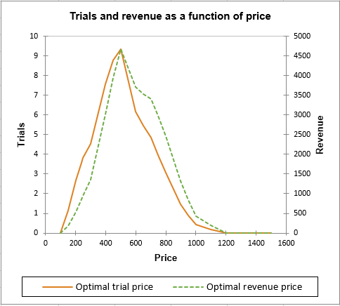 The graph above allows to observe the evolution of the volume and the revenue according to the prices. We see that the optimum is clearly equal to 500â¬.