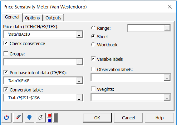In the General tab, select the four variables "Too cheap", "Cheap", "Expensive", "Too expensive" in the Price Data field. Since this selection includes the name of the variable, check the option Column labels.