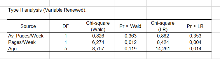 From the probability associated with the Chi-square tests, we can see that the variable that most influences the renewal is the number of pages viewed the previous week (p = 0.012).