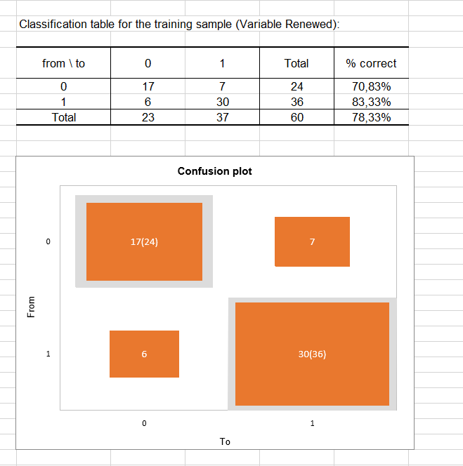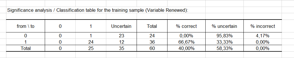 The classification table for the training sample (sometimes called the confusion matrix) is then displayed in the report. This table shows the percentage of observations that were well classified for each modality (true positives and true negatives). For example, we can see that the observations of modality 0 (no renewal) were well classified at 70.83% while the observations of modality 1 (renewal) were well classified at 83.33%.