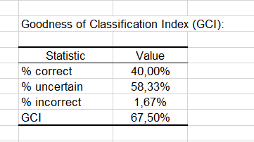 The GCI table shows that 40% of the observations were well classified (true positives), 58.33% had an uncertain classification and only 1.67% were incorrectly classified (false positives and false negatives cumulated). The GCI (Goodness of Classification Index) is 67.50%, which means that the predictive quality of this classification model is good.