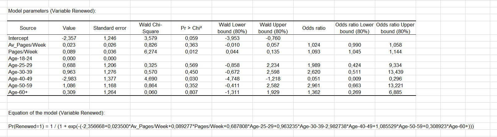 As the Age variable is qualitative (because it is divided into groups), we can determine whether each modality influences the renewal decision. It appears that the group of “40-49” age has a significant negative impact (-2.983). Marketing and editorial managers can investigate this further to understand why. The other age groups do not have any significant effect.