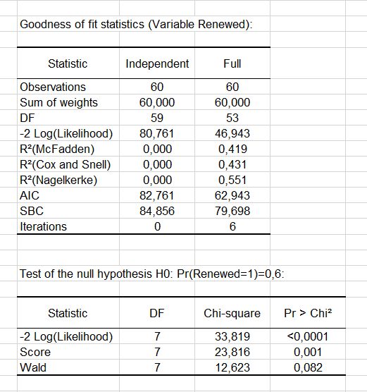 The goodness-of-fit statistics table gives several indicators of the quality of the model (or goodness of fit). These results are equivalent to the R² of the linear regression and the ANOVA table. The most important value is the Chi² associated with the Log ratio (L.R.). It is the equivalent of Fisher's F-test of the linear model: we try to evaluate if the variables provide a significant amount of information to explain the variability of the response variable. In our case, as the probability is lower than 0.0001, we can conclude that the variables bring a significant amount of information.