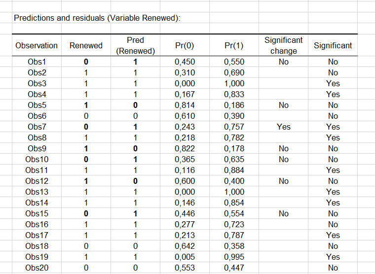 The column Significant change indicates that the change in value between the predicted modality and the observed one. The second column Significant indicates if the probability of the predicted modality is significantly different than the ones of the other modalities. In the case of the 7th observation, we can see that the change is significant and the probability of renewing (0.757) is higher than that of not renewing (0.243).