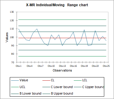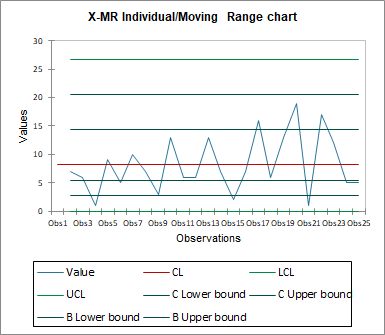 - MR moving range: It is useful to analyze the variability of the production. Large differences in production, caused using different production lines, will be easily visible.