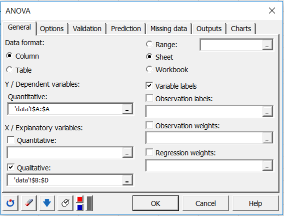 In XLSTAT, it is possible to select the data in two different ways for a three-way ANOVA. The first one, in the form of columns, requires one column for the dependent variable, and three others for the explanatory variables.
