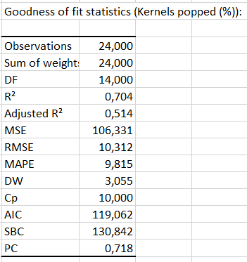 The data correspond to an experiment in which three types of microwaves were tested to explain the percentage of edible popcorn after cooking. The cooking differs according to the brand of the microwave, the power, and the time.