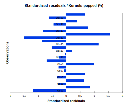 Finally, we can also look at the standardized residuals. These are residuals that, given the assumptions of the ANOVA model, should be normally distributed; i.e., 95 percent of the residuals should be in the interval [-1.96, 1.96]. All values outside this interval are potential outliers or might suggest that the normality assumption is wrong. It appears here that there is no outlier, as all values are in the one [-1.96, 1.96] range.