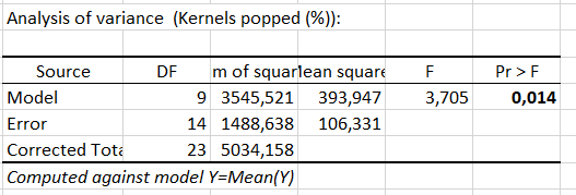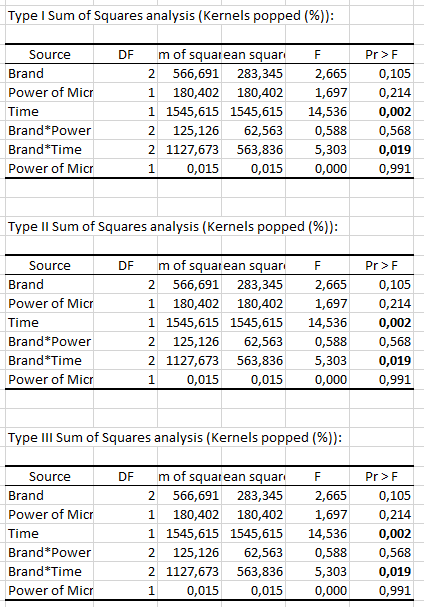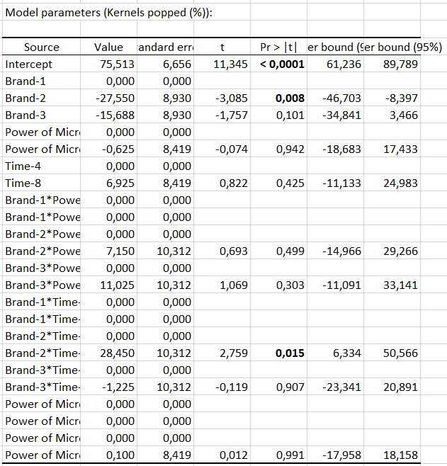 Select the data on the Excel sheet. The dependent variable corresponds to edible popcorns (%) whose variability we want to explain by the factors brand, power, time as well as their interactions.