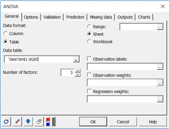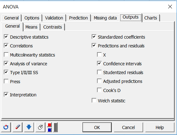 In the Outputs tab, the Type SS options were activated because so that the model takes the interactions into account and so that we can analyze the F values given in the Type I SS, and Type III SS tables (SS stands for sum of squares).