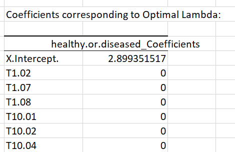 First, the value of Lambda which minimizes deviance is displayed: This is followed by the corresponding computed coefficients for all genes: