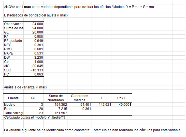 Finalmente, se muestra una lista de ANOVA con cada parámetro considerado como variable dependiente. Por ejemplo, puede ver a continuación que se encontró que la variable de inicio T es constante. No aporta ninguna información para distinguir entre productos y ha sido rechazada del análisis.