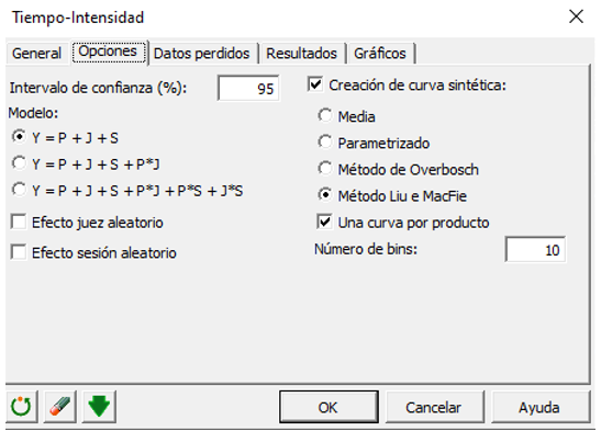En el lado izquierdo se proponen 3 configuraciones de modelo para realizar el ANOVA sobre los parámetros extraídos. Elegimos el primero donde no se considera interacción entre Producto, Juez o Sesión. En el lado derecho, puede activar la opción de creación de curva sintética y seleccionar el método Liu y MacFie. Como deseamos generar una curva sintética por producto, asegúrese de que la casilla de verificación Una curva por producto esté activada. Finalmente, el número de bins debe establecerse en un valor predeterminado de 10.