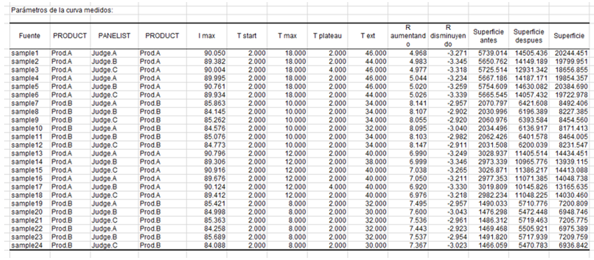 La siguiente tabla que se muestra a continuación resume los parámetros de la curva medidos. Esas son las 10 magnitudes descriptivas medidas en las 24 curvas de intensidad individuales. La tabla también indica el Producto, Evaluador y Sesión correspondientes para que toda la información se recopile en una sola tabla.