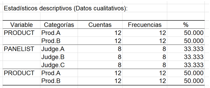 En la hoja de resultados, la primera tabla muestra estadísticas descriptivas para la variable Producto, los Jueces y la Sesión. Como puede ver a continuación, cada categoría de cada variable se enumera junto con su frecuencia de aparición en el conjunto de datos.