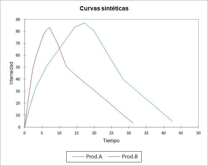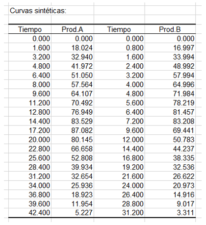 La tabla que sigue es la tabla de curvas sintéticas. Como se muestra a continuación, proporciona la coordenada de intensidad y tiempo de ambas curvas sintéticas, la del producto A y la del producto B.