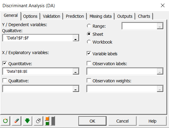 Una vez el botón presionado, aparece el cuadro de diálogo correspondiente al análisis Factorial Discriminante (AFD). Puede entonces seleccionar los datos en la hoja Excel. La "Variable dependiente" corresponde a la variable explicada, que es, en este caso preciso, la especie de Iris. Las variables explicativas son las cuatros variables que disponemos. Se deja la opción "Etiquetas de las columnas" activada ya que la primera fila de las columnas incluye el nombre de las variables. Cuando hace clic en el botón "Más" del cuadro de diálogo, aparece la parte inferior del cuadro de diálogo (le botón "Más" se convierte entonces en "Menos"). La parte inferior corresponde a las opciones avanzadas. Hemos deshabilitado la opción "Igualdad de las matrices de covarianza intra-grupos", ya que como lo veremos más tarde (Prueba de Box), efectuar una semejante hipótesis seràa falso.