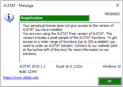 After installing XLSTAT, you will get the following error message if: You have a perpetual license but you have no longer access to free upgrades and support.
