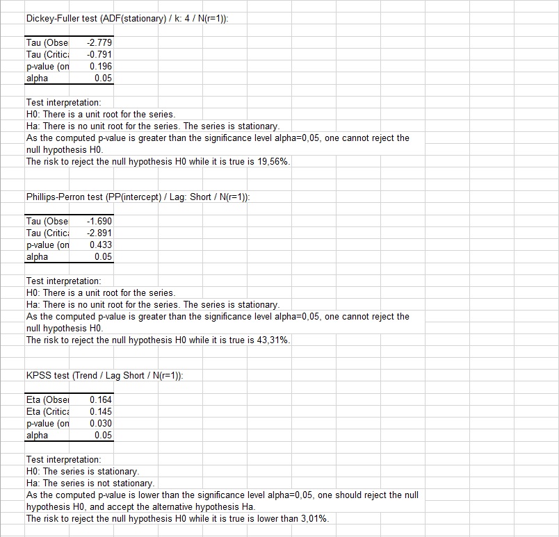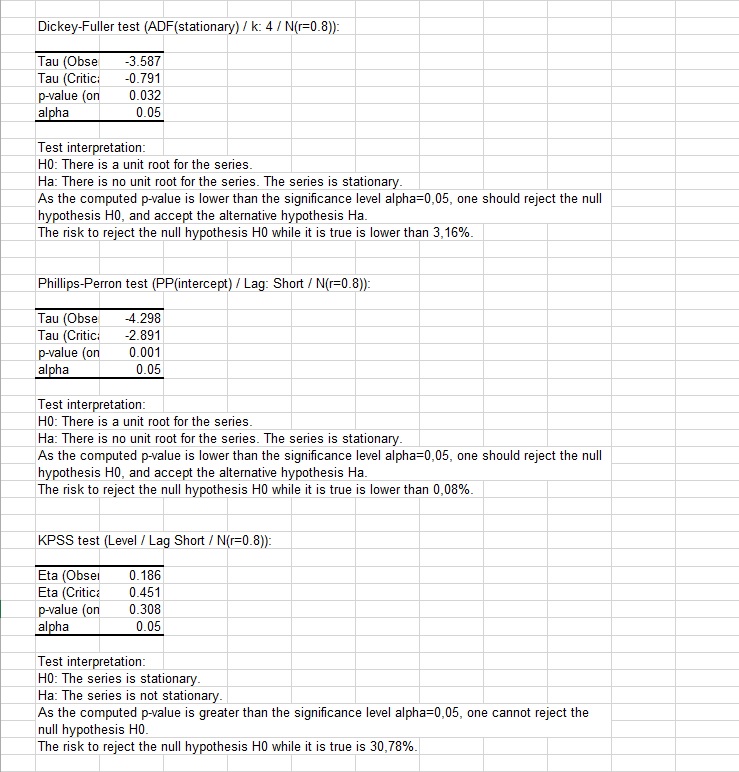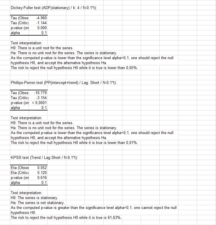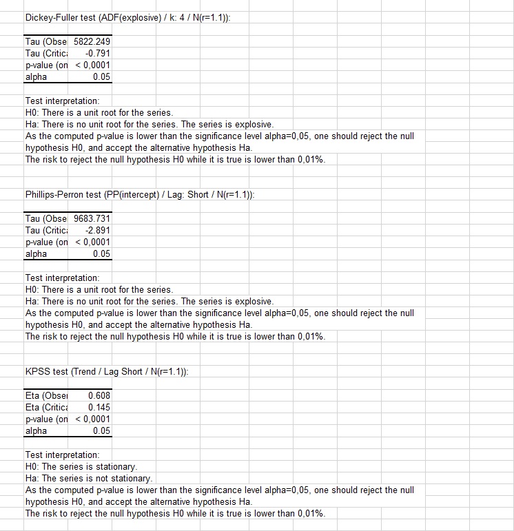 Para la serie de tiempo en las columnas F (ver resultados en la hoja de Dickey-Fuller|Phillips-Perron3), cambiamos la opción alternativa al explosivo para la prueba ADF y su tendencia para la prueba KPSS. La prueba KPSS conducen a la conclusión de que la serie no es estacionaria, mientras que las dos pruebas de raÃz unitaria rechazan la hipótesis de una raÃz unitaria en el mecanismo de generación de datos.