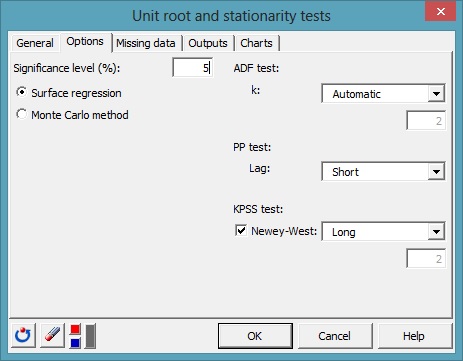 En la pestaña Opciones, se puede elegir entre las dos opciones propuestas para estimar los valores de p y los valores crÃticos para ambas pruebas de raÃz unitaria. La opción de regresión superficie utiliza el enfoque propuesto por MacKinnon (J. G. MacKinnon, âNumerical Distribution Functions for Unit Root and Cointegration Testsâ, J.A.E., 1996), mientras que la opción Monte Carlo utiliza un número predeterminado de simulaciones. A continuación, se muestran los resultados de la prueba.