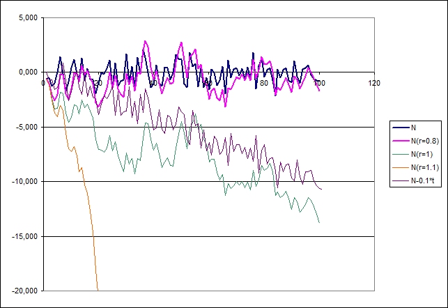 Puede descargar una hoja Excel que contiene los datos y los resultados haciendo clic aquÃ. Los datos han sido generados utilizando una muestra normal al azar N(0, 1) de 100 observaciones (serie N), una serie estacionaria construida a partir de esa muestra (serie rho =0.8), una serie autocorrelacionada (rho = 1) y una serie de tiempo explosiva (rho=1.1), y una serie que varÃa linealmente con el tiempo (N-0.1t).