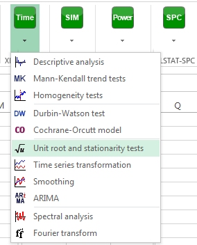 Una vez iniciado XLSTAT, elija el comando XLSTAT / Análisis de series temporales / Pruebas de raÃz unitaria y estacionariedad.