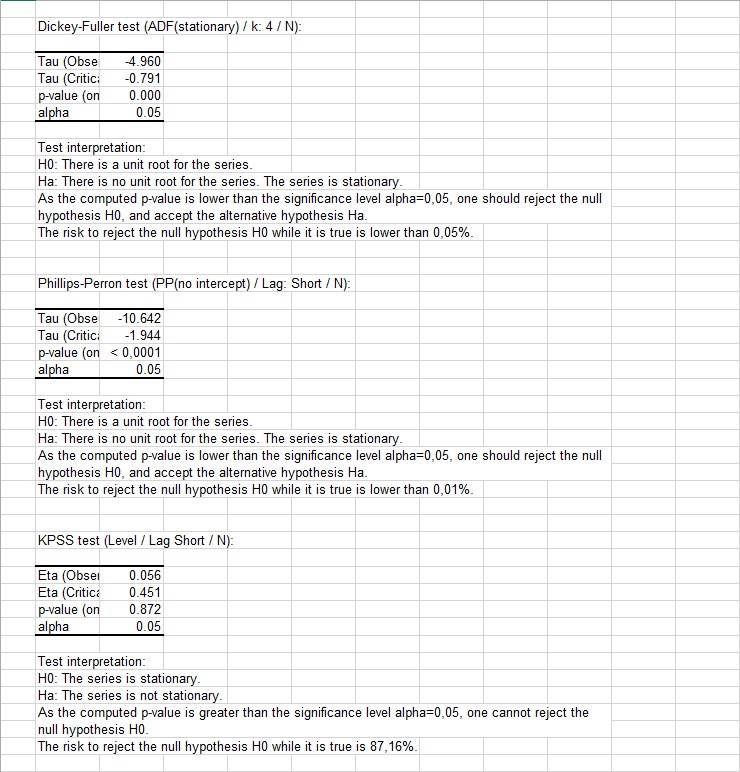 Se dice que una serie de tiempo Y_t (t = 1,2 ...) es estacionaria (en el sentido débil) si sus propiedades estadÃsticas (expectativa, varianza, autocorrelación) no varÃan con el tiempo. El ruido blanco es un ejemplo de una serie de tiempo estacionaria, con el caso, por ejemplo, en que Y_t sigue una distribución normal N(mu, sigma^2) independiente de t. Identificar que una serie no es estacionaria permite estudiar después, de dónde proviene la no estacionariedad. Una serie no estacionaria puede, por ejemplo, ser estacionaria en la diferencia (también denominada integrada de orden 1): Y_t no es estacionaria, pero la diferencia Y_t - Y_{t-1} es estacionaria. Es el caso del paseo aleatorio (random walk). Una serie también puede ser estacionaria en tendencia. Las pruebas de estacionariedad poder comprobar si una serie es estacionaria o no. Hay dos enfoques diferentes: pruebas de estacionariedad como la prueba KPSS que consideran como hipótesis nula H0 que la serie es estacionaria, y pruebas de raÃz unitaria, tales como la prueba de Dickey-Fuller y su versión aumentada (prueba de Dickey-Fuller aumentada, ADF), o la prueba de Phillips-Perron (PP), para las cuales la hipótesis nula es por el contrario que la serie posee una raÃz unitaria y por lo tanto no es estacionaria. XLSTAT incluye a fecha de hoy 4 pruebas de raÃz unitaria: la prueba de Dickey-Fuller, la prueba ADF, la prueba PP y la prueba de estacionariedad KPSS.