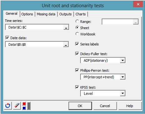 Este tutorial le mostrará cómo configurar e interpretar pruebas de raÃz unitaria y estacionariedad (unit root and stationarity tests) - pruebas de Dickey-Fuller, Phillips-Perron & KPSS - en Excel usando XLSTAT.