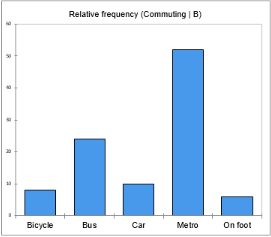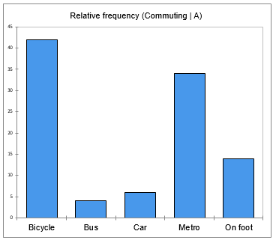 - The Relative frequency per category (%): 42% of the respondents living in city A go to work by bicycle while only 3% use their car.