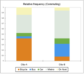 We may thus say that city A is more cycle-friendly than city B or that people living in city B work relatively far from their home so cycling or walking is not the best option for them. - Stacked bars