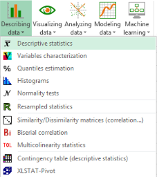 - Once XLSTAT is open, select the XLSTAT / Describing data / Descriptive statistics command as shown below.