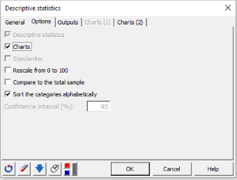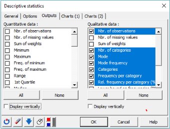 - In the Outputs tab, select the following statistics: Nbr of observations, Nbr of categories, Mode, Mode frequency, Categories, Frequency per category and Rel. frequency per category (%).