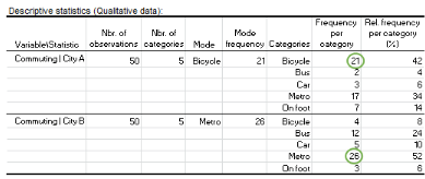 An Excel sheet with both the data and the results can be downloaded by clicking on the button below: Download the data The data represent the results of a survey on how people living in two different cities commute to work. Rows correspond to respondents and columns to the mode of transportation as well as to the city they live in. Here the city and the mode of commuting are qualitative variables, also referred to as nominal or categorical variables. The values a qualitative variable may take (Bicycle, Bus, Car… in the case of transportation mode) are called categories, or levels. Our goal here is to describe transportation preferences when commuting to work per city using: 1. Common Descriptive statistics: