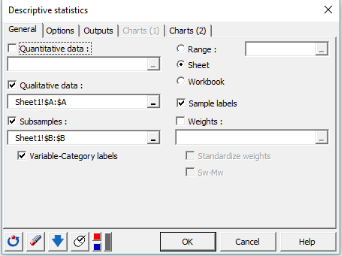 We also want to display Variable-Category labels in the output. These include the variable name as a prefix and the category name as a suffix. Finally, select the Sheet option in order to display the results on a new sheet and the Sample labels to consider the first row of the data table as labels.