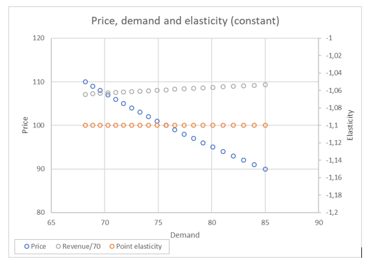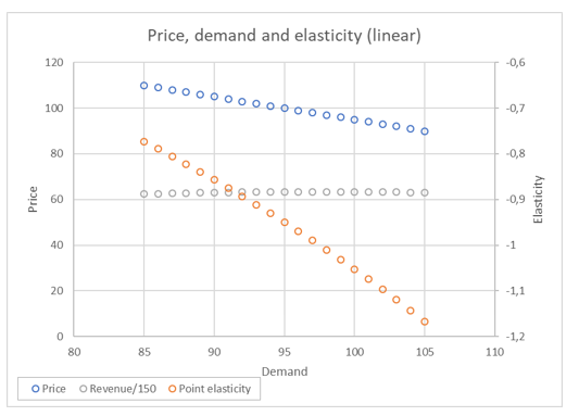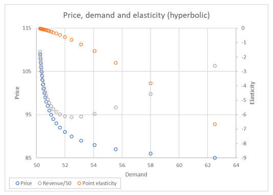 Let’s build a few cases to understand how the curves would look like with different types of elasticities. Imagine a case where quantities sold diminish linearly with the increase in prices with a slope a (Q=aP+b). This means that Ed=a(aP+b)/P. Figure 1 corresponds to a case where a=-1 and b=195. We can see that on the lower part of the price range, the demand is elastic, and it becomes inelastic when prices increase. Figure 1: Elasticity in a case of linear relationship Note: When reading the revenue on the above curve, to know the price at which it is generated, you need to read the price curve for the same demand value and find the corresponding value on the ordinate axis. In figure 1, the maximum revenue (rescaled for convenience) is obtained at a price of 97.5 and corresponds to elasticity of -1. Above this price the demand is inelastic and below it is elastic. Hereunder we display an example with a hyperbolic relationship between demand and prices. The higher the prices, the lower the impact on quantities. Figure 2: Elasticity in a case of hyperbolic relationship